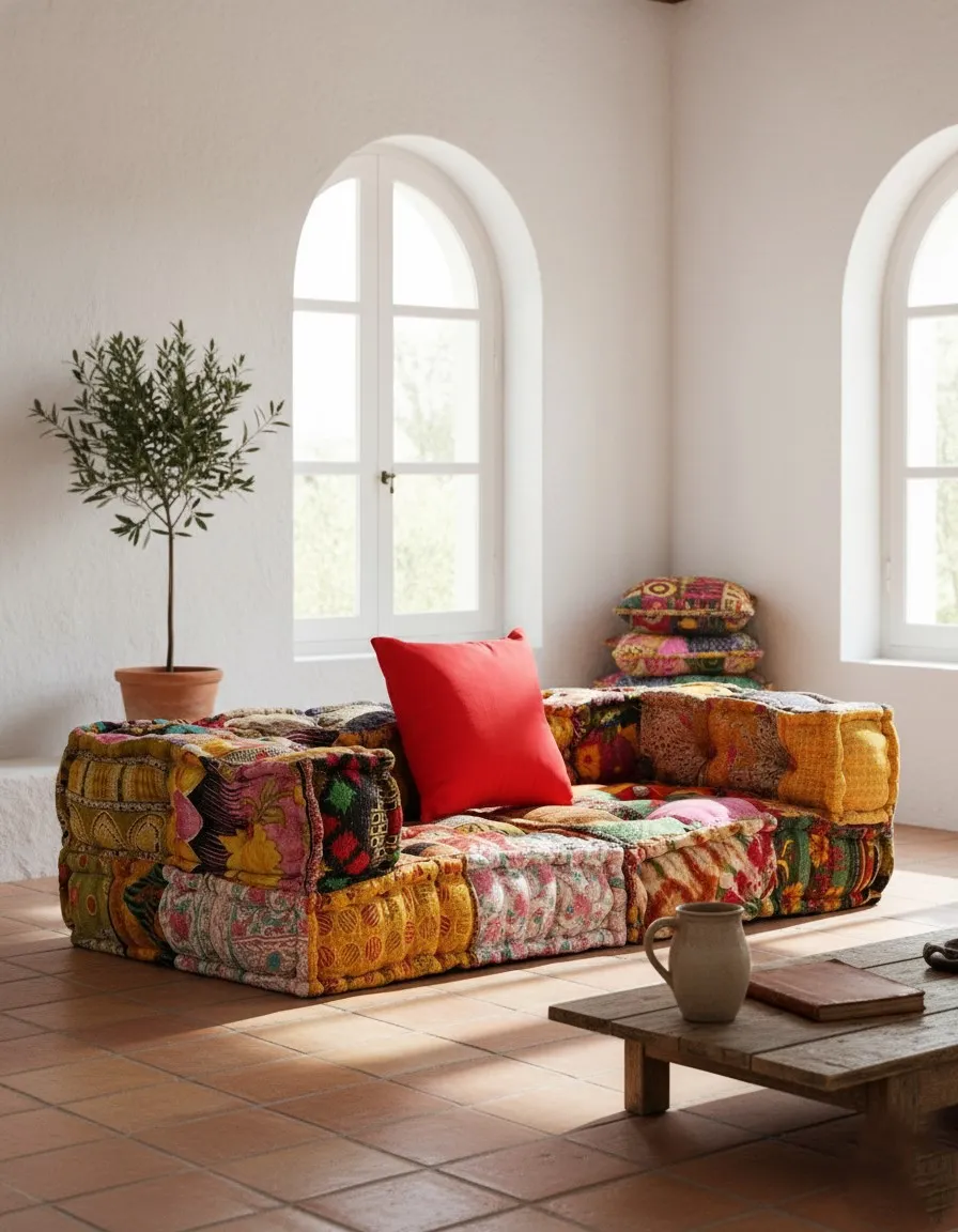 Materiał patchworkowy zapewnia wyjątkowe doznania estetyczne: to losowy zestaw różnych barw i wzorów, które, na pozór chaotyczne, tworzą jednak ze sobą unikalną, przyciągającą wzrok całość, która nie znudzi się tak łatwo jak jednorodne meble. Jest to świetny wybór np. jako główny akcent w aranżacji wnętrza, które poza tym jest utrzymane w minimalistycznych barwach i formach. Wtedy sofa z pewnością będzie zwracać uwagę i nabierze charakteru bardziej świadomego wyboru dekoracyjnego. Ale tak samo polecamy Ci ją, jeśli zwyczajnie lubisz żywe kolory, chcesz rozweselić pokój, szukasz czegoś młodzieżowego lub jesteś fanem stylu alternatywnego, boho czy eklektycznego. Model Montanex 1D to najbardziej podstawowa wersja sofy z dodatkową poduszką w pięknym żywym odcieniu pomarańczowej czerwieni. Sofa Demri zapewni Ci komfort i doskonały nastrój podczas wieczorów filmowych, z książką, w towarzystwie, pod kocem a nawet na werandzie w chłodne wieczory. Sprawdzi się też świetnie jako bezpieczna, miękka powierzchnia do zabawy dla dzieci. Odważ się na mocny akcent w wystroju mieszkania!