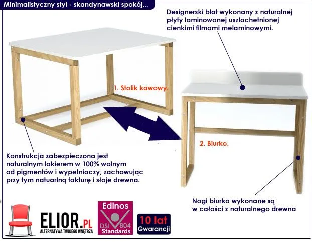 Prezentujemy Ci jakże efektowne wizualnie i bardzo praktyczne w użytkowaniu biurko oraz stolik Kizo X10 marki Elior. Mebel wykonany został z prawdziwego drewna (sosna skandynawska) oraz naturalnej płyty meblowej. Spokój płynący z wnętrza mebla Inelo, pozwoli w końcu Twoim domownikom zająć się efektywną pracą i fascynującą zabawą a Twoje wnętrze, nabierze prawdziwie nowego designu.