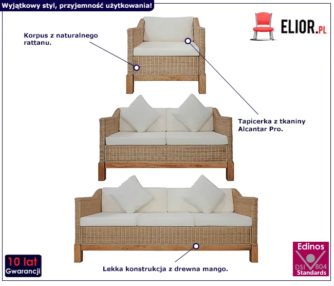 Materiał: naturalny rattan + rama z litego drewna mango + tapicerka z tkaniny Alcantar Pro