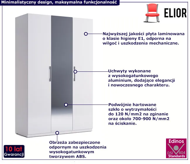 Wilhelm 12X marki Elior to nie tylko szafa, to prawdziwy manifest nowoczesnego stylu. Ten funkcjonalny i elegancki mebel doskonale wpisuje się w atmosferę współczesnych wnętrz. Z lustrem na froncie, które optycznie powiększy przestrzeń, Wilhelm 12X oferuje nie tylko miejsce na przechowywanie, ale także na eksponowanie Twojej osobowości. Zaprojektowana, by sprostać wymaganiom najbardziej wymagających, ta szafa stanowi doskonałe rozwiązanie łączące w sobie design i praktyczność. Idealna do salonu czy sypialni, zachwyci swoim designem i wysoką funkcjonalnością.