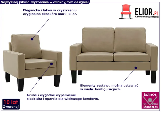 Designerska tapicerka wykonana została z najwyższej jakości ekoskóry (skóry ekologicznej), łatwej do utrzymania w czystości. Ekoskóra używana przy produkcji mebli marki Edinos Premium jest o wiele bardziej odporna na słońce oraz substancje płynne , co pozwala Ci na długie i bezpieczne użytkowanie. Już nie musisz się martwić, że rozlana kawa spowoduje konieczność wymiany mebla. Skóra ekologiczna została pokryta warstwą polichlorku winylu. Za komfort siedzenia odpowiada grube wypełnienie z poliestru. Dzięki zastosowaniu wiązań estrowych jest on sprężysty i odporny na gniecenie. Sprawia to, że siedzisko jest wytrzymałe i wygodne. Nie obawiaj się, że po latach użytkowania Twoja sofa nabawi się brzydkich i niewygodnych odkształceń.