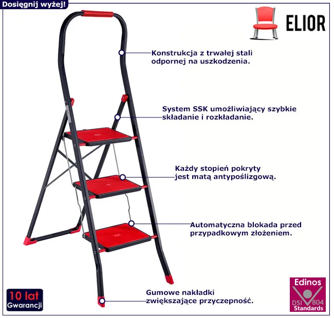 Zmiana firanek. To dopiero wyzwanie. Najpierw prasowanie. Wielki, plątąjący się kawałek tkaniny najchętniej owinąłby Cię dwa razy wkoło i jeszcze pochłonął deskę. To nic - dałaś radę. Ale to nie koniec. Podstawiasz krzesło, stajesz na nim na palcach i ledwo dosięgasz żabek. No nie. Targasz więc przez pół pokoju stół, który pozwoli Ci sięgnąć wyżej. Z drętwiejącymi rękami wieszasz królową firankę, po czym padasz ze zmęczenia. Jeszcze tylko 3 okna... Zastanów się, czy na pewno tak to musi wyglądać? Nie lepiej skorzystać z prostszego rozwiązania? Miej zawsze pod ręką drabinkę Nexti 3X marki Edinos Premium!