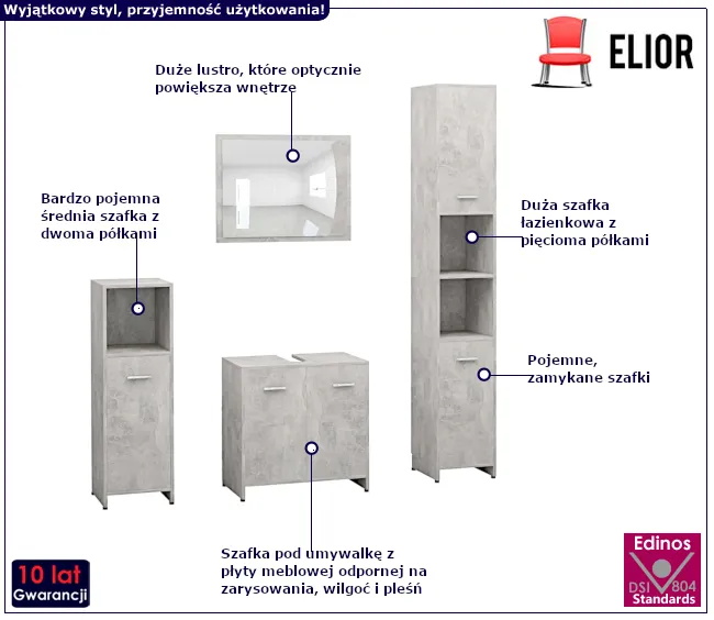 • Produkt posiada certyfikat jakości "Edinos Standards DSI 804", który potwierdza najwyższą jakość wykonania mebla oraz pełny stopień zgodności poszczególnych jednostek wytworzonego wyrobu z przyjętym wzorcem.