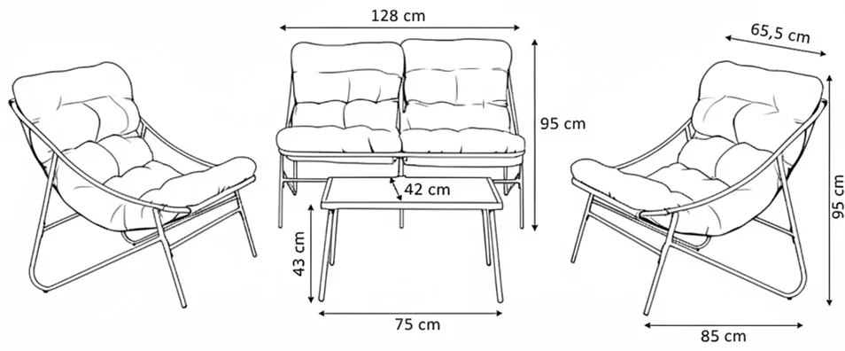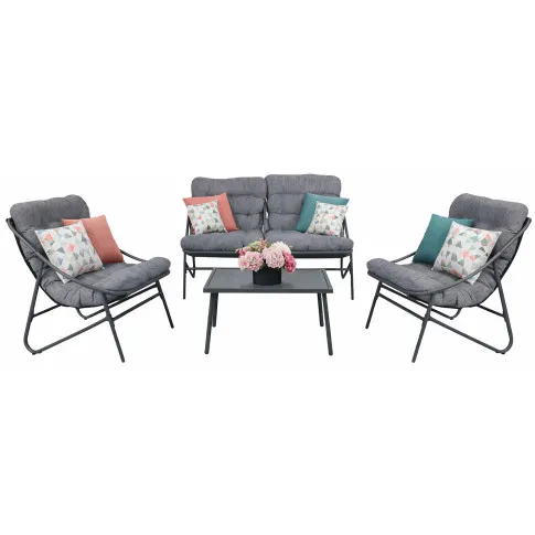 • Kompletny zestaw wypoczynkowy składający się z dwóch wygodnych krzeseł, dwuosobowej sofy oraz praktycznego stolika kawowego