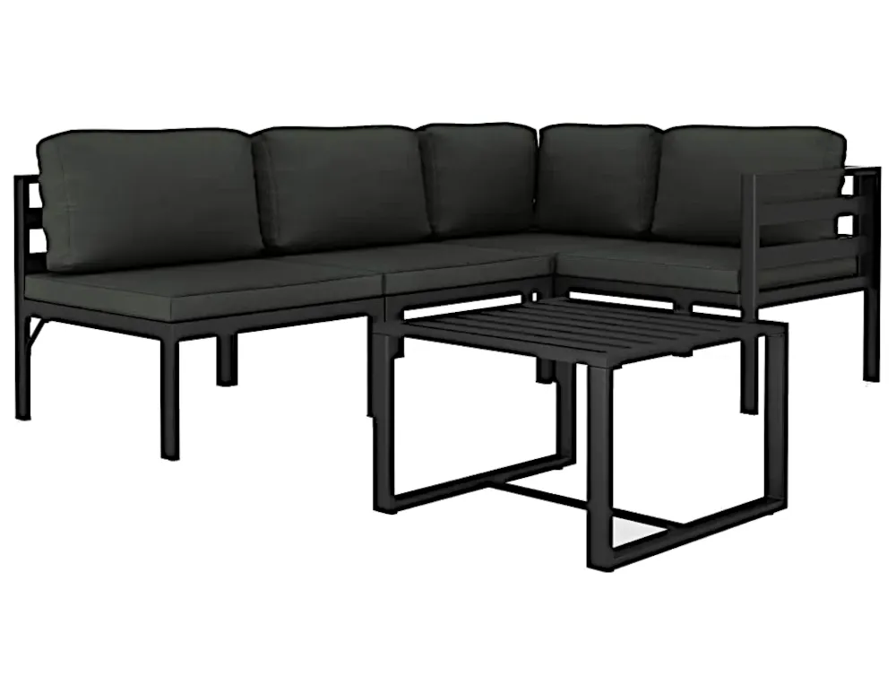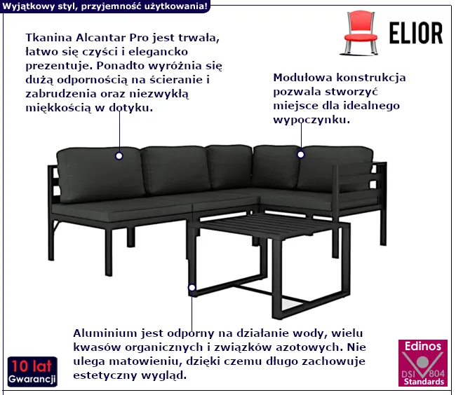 • Pięcioczęściowy, modułowy układ: dwie sofy narożne, dwie sofy środkowe i stolik, idealny na każdą okazję.