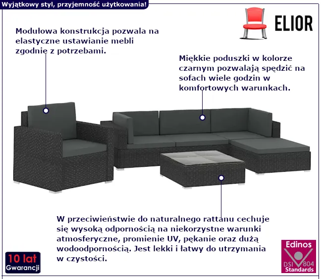 Zestaw wypoczynkowy Yantar marki Edinos Premium to esencja luksusu, która przenosi Twój ogród na wyższy poziom komfortu i stylu. Wyobraź sobie leniwe popołudnia spędzone w promieniach słońca lub wieczorne spotkania z przyjaciółmi przy filiżance herbaty, otoczony wygodą, jaką oferują eleganckie meble Yantar. Dzięki modułowej konstrukcji masz pełną swobodę aranżacji, dostosowując układ mebli do swoich potrzeb i przestrzeni. Technorattan, z którego został wykonany zestaw, nie tylko dodaje mu nowoczesnego uroku, ale również gwarantuje odporność na kapryśną pogodę. Miękkie, czarne poduszki wprowadzają nutę wyrafinowania i sprawiają, że każdy moment spędzony w ogrodzie staje się prawdziwą przyjemnością. Yantar to więcej niż tylko meble – to zaproszenie do codziennego relaksu na świeżym powietrzu.