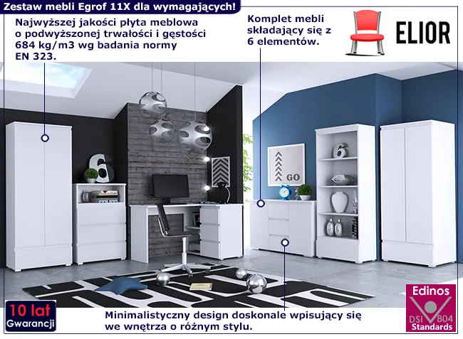 Niech każdy mebel z kolekcji Egrof od Elior stanie się świadectwem Twojego zmysłu estetycznego i pragnienia organizacji. Wybierz 6 elementowy zestaw mebli Elsinor 11X i ciesz się pięknem, które trwa. Zdecyduj się już dzisiaj na zakup w rewelacyjnej cenie 4998 zł.