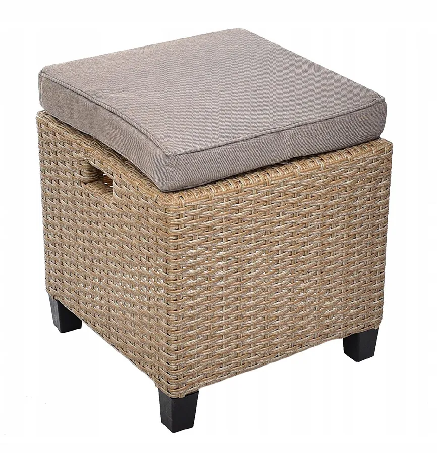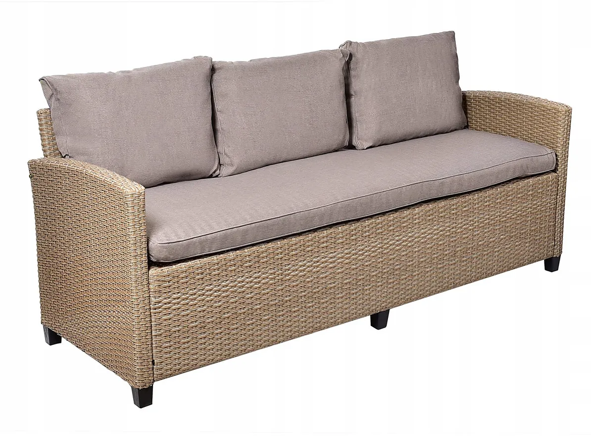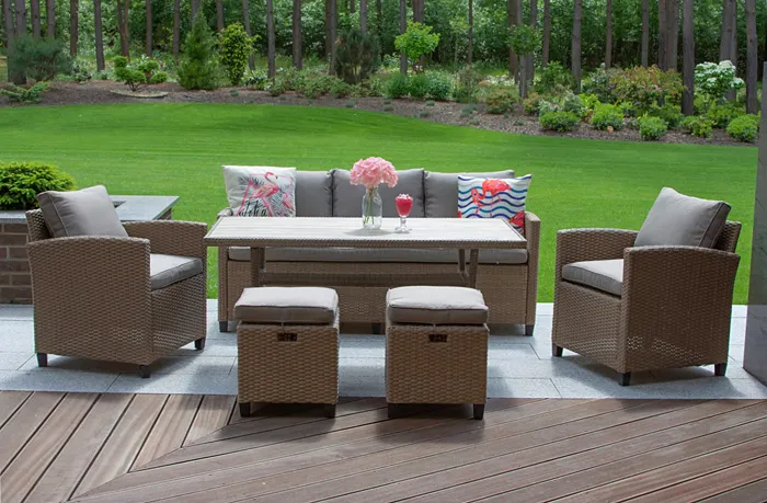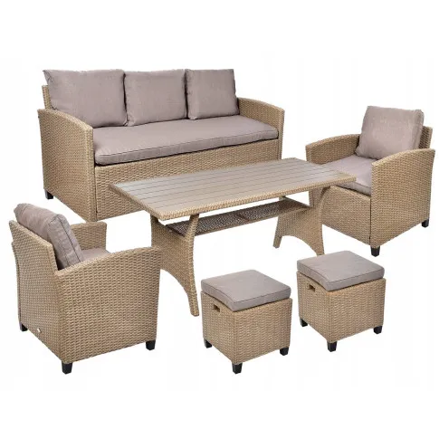 • Kompletny zestaw: obejmuje stół, sofę, 2 fotele, 2 pufy i poduszki, oferując kompleksowe rozwiązanie do wypoczynku na świeżym powietrzu.