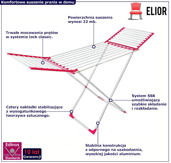 Z suszarką Akromi marki Elior możesz suszyć pranie zarówno w domu, jak i na balkonie. Szybkie składanie i rozkładanie, duża powierzchnia na ubrania, stabilna konstrukcja. Właśnie takiej suszarki szukasz! Zamów ją w promocyjnej cenie 168 zł już dziś!