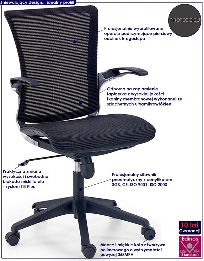 Czy wiesz, że według specjalistów europejskiej ortopedii właściwie dopasowane krzesło oraz biurko chronią Cię przed schorzeniami kręgosłupa takimi jak skolioza idiopatyczna, a w następstwie przed koniecznością poddawania się leczeniu wad postawy? Fotel obrotowy Reforso posiada perfekcyjnie wyprofilowane oparcie, które podtrzymuje odcinek piersiowy kręgosłupa i w efekcie pozwala na pracę przy biurku bez bólu i niewygody. Designerska tapicerka fotela pokryta została wysokiej jakości tkaniną membranową wykonaną ze szlachetnych ultramikrowłókien. Mikrosiatka Profeos pozwala na oddychanie skóry oraz zapobiega nadmiernemu przegrzewaniu się ciała. Lekki i wytrzymały korpus fotela wykonany został z najwyższej jakości aluminium, co gwarantuje mu niezwykłą trwałość i niepodatność na zarysowania. Fotel ten bez wątpienia zadowoli wszystkich wielbicieli wygody i wysmakowanego designu. Nie musisz ryzykować nabycia wad postawy spowodowanych użytkowaniem tanich, chińskich krzeseł. Zainwestuj w zdrowie Twoje i Twoich najbliższych kupując wysokiej jakości fotel marki Profeos.