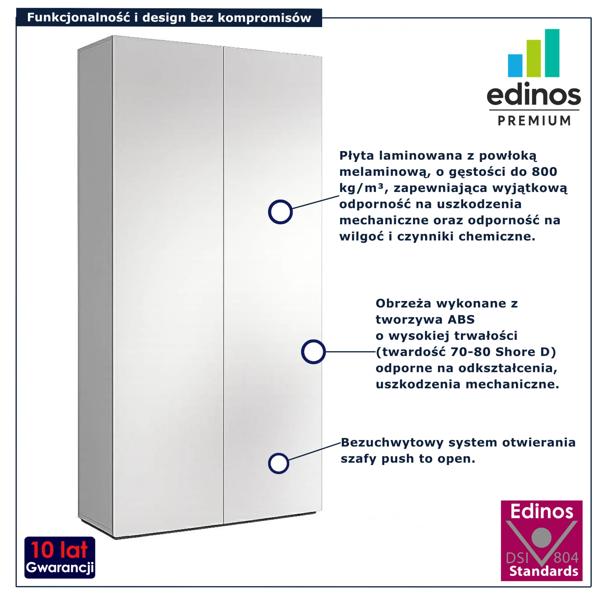 • Produkt posiada certyfikat jakości "Edinos Standards DSI 804", który potwierdza najwyższą jakość wykonania mebla oraz pełny stopień zgodności poszczególnych jednostek wytworzonego wyrobu z przyjętym wzorcem.