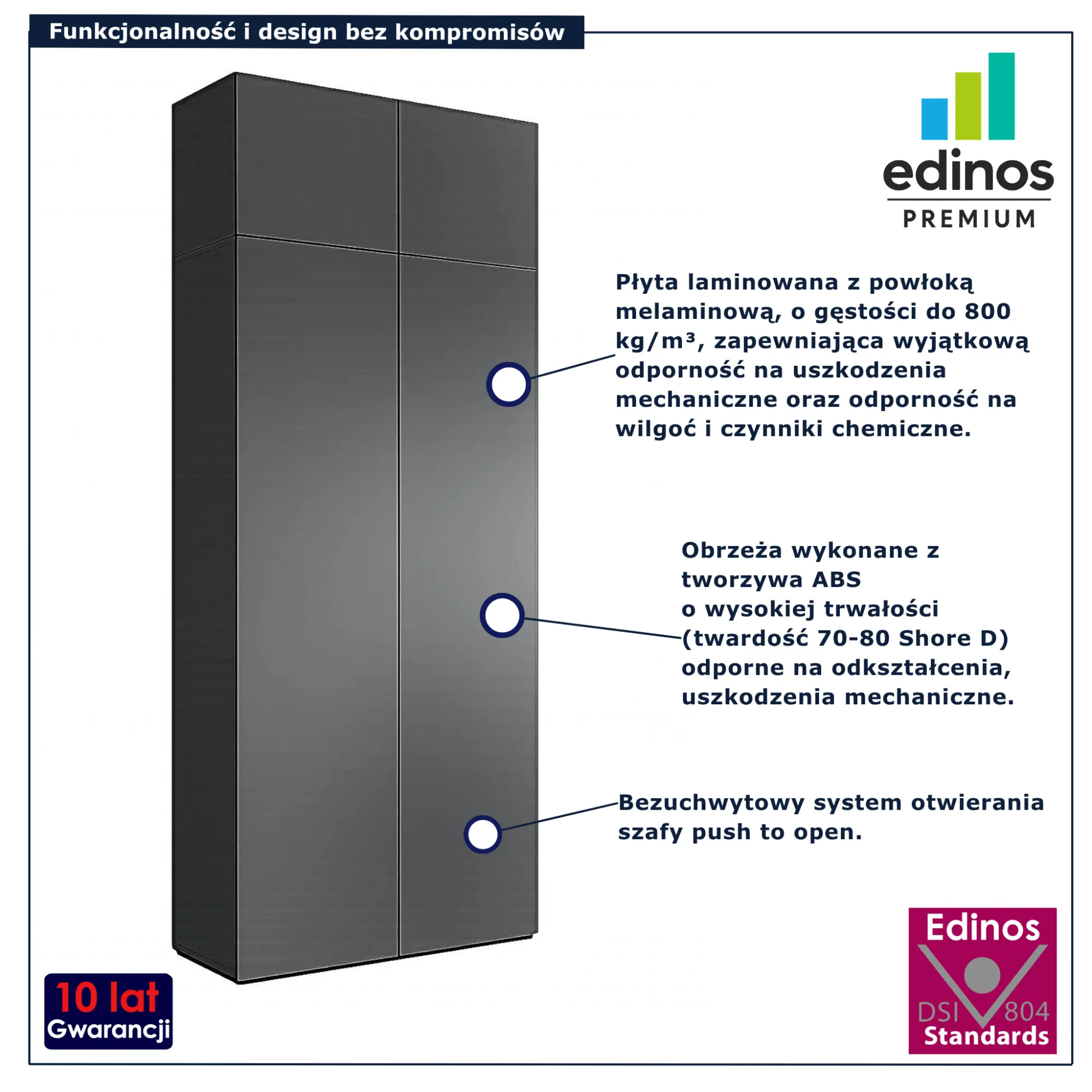 • Produkt posiada certyfikat jakości "Edinos Standards DSI 804", który potwierdza najwyższą jakość wykonania mebla oraz pełny stopień zgodności poszczególnych jednostek wytworzonego wyrobu z przyjętym wzorcem.