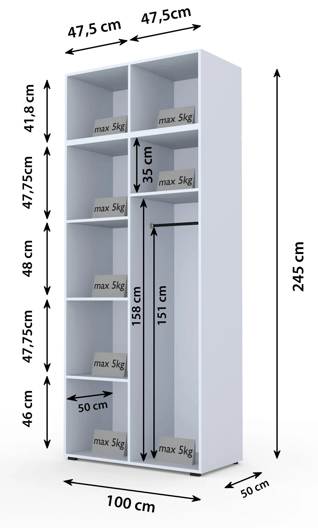 • szerokość: 100 cm, wysokość: 245 cm, głębokość: 50 cm.