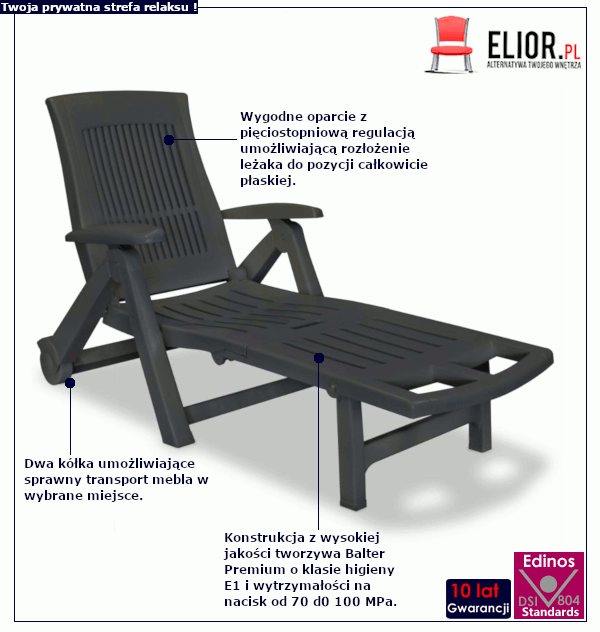 • Modny kolor: antracytowy. Szukasz innego leżaka na taras lub do ogrodu? Kliknij w link i sprawdź leżaki ogrodowe w sklepie Edinos.pl. Stwórz swój praktyczny zestaw mebli.