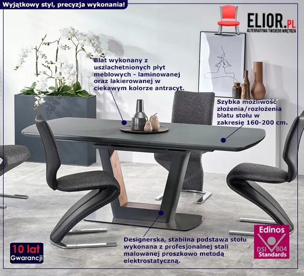 - Producent: Edinos Premium. href="https://www.youtube.com/watch?v=3Gt3BWzk9pU" rel="nofollow" target="_blank">Kliknij i zobacz film o stołach marki Edinos Premium.- Produkt posiada certyfikat jakości "Edinos Standards DSI 804", który potwierdza najwyższą jakość wykonania mebla oraz pełny stopień zgodności poszczególnych jednostek wytworzonego wyrobu z przyjętym wzorcem.
