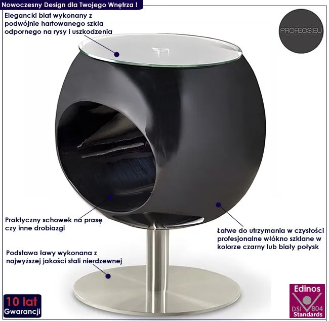 Luksusowy i komfortowy stolik kawowy Bohosa w kolorze czarny połysk wyróżnia się nie tylko swoją praktyczną formą i eleganckim kształtem, ale także zastosowaniem materiałów ponadprzeciętnej jakości. To dlatego cieszy się on powodzeniem wśród osób lubiących nowatorskie rozwiązania i szybko zyskał status bestsellera. Niecodzienna w formie konstrukcja ławy wykonana została z lakierowanego tworzywa pokrytego włóknem szklanym o średnicy 9 um. Materiał ten składa się z duroplastycznych żywic epoksydowych oraz pasm włókien ustawionych w jednym kierunku, co nadaje ławie ponadprzeciętne cechy wytrzymałościowe. Designerski blat o okrągłym kształcie wykonano z podwójnie hartowanego szkła, dzięki czemu jest całkowicie odporny na rysy i uszkodzenia. Użyta do wyrobu podstawy i nogi mebla stal nierdzewna nadaje mu modnego i nowoczesnego charakteru. Ten designerski, wyszukany mebel pomoże Ci zmienić charakter utrzymanego w monotonnej stylistyce pomieszczenia. Awangardowo prezentująca się, charakterystyczna ława to zdecydowanie najważniejszy akcent salonu.