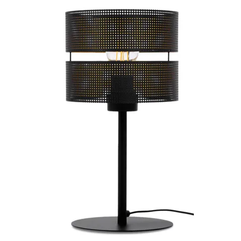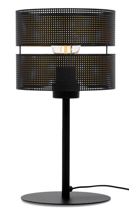 Elegancka lampka Amfa przyciąga wzrok i oferuje funkcjonalność, jakiej oczekuje się od nowoczesnego oświetlenia. Czarny abażur ze złotym wnętrzem składa się z dwóch części, które razem tworzą efektowną całość. Sam klosz posiada ażurową strukturę, dzięki której światło rozprzestrzenia się w niesamowity sposób. Zastosowanie złotego koloru dodaje lampce luksusowego charakteru, który świetnie współgra zarówno z nowoczesnymi, jak i bardziej klasycznymi aranżacjami. Idealnie zaprezentuje się w salonie i sypialni. Wydobywające się z niej światło wprowadzi do wnętrza ciepłą, elegancką aurę. Dzięki wykorzystaniu trwałych materiałów zachowa swoją jakość i wygląd przez długie lata.