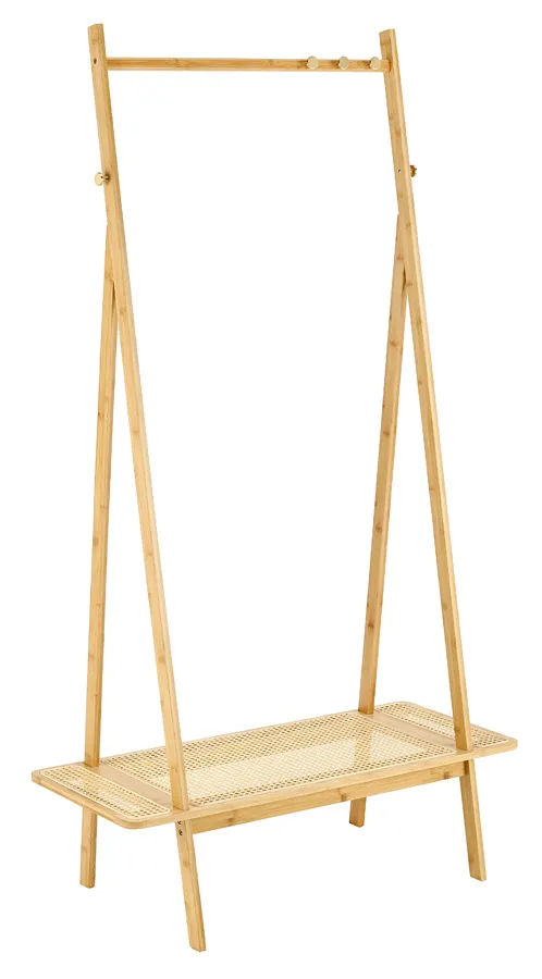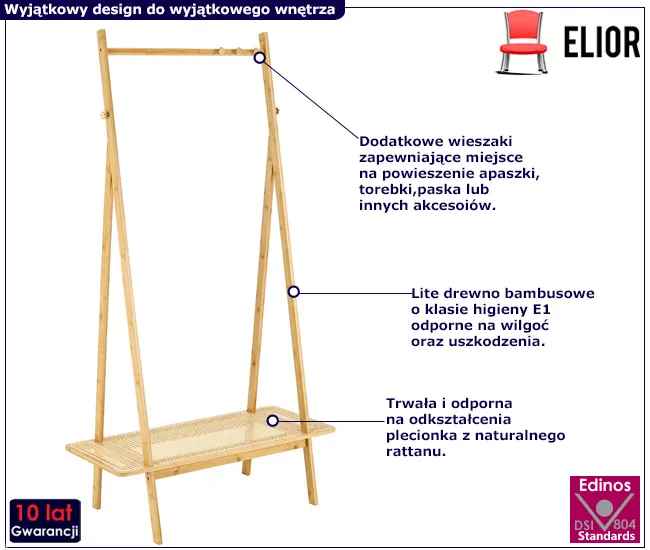 Wieszak na ubrania Agira marki Edinos Premium wykonany z drewna bambusowego z półką z naturalnego rattanu to mebel, który nie tylko zapewni porządek w Twojej garderobie, ale także doda jej naturalnego uroku. Dzięki niemu uporządkujesz wszystkie najpotrzebniejsze części garderoby w jednym miejscu, unikając bałaganu spowodowanego wiszącymi na krzesłach kurtkami czy ustawionymi pod ścianą butami. Przekonaj się jak wiele zyskasz dzięki wieszakowi Agira!