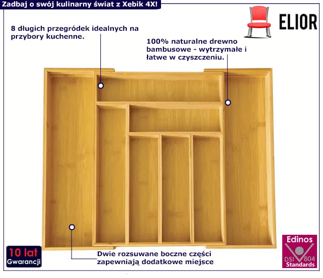 Bambusowy wkład na sztućce - Vaso 4X marki Elior to esencja klasycznej elegancji i funkcjonalności w jednym. Doskonale zorganizowany wkład na sztućce, który nie tylko uporządkuje Twoją kuchnię, ale również doda szczyptę stylu do Twojej codzienności. Przekonaj się, jak Vaso 4X może zmienić Twoje kulinarne przestrzenie.