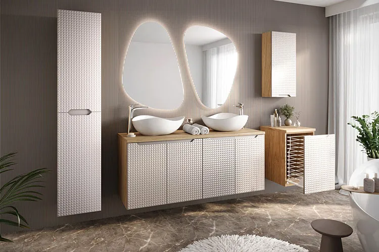 Poznaj nowy wymiar elegancji z kolekcją mebli łazienkowych Verdum marki Edinos Premium, która przedefiniowuje pojęcie nowoczesnego designu. Każdy element tej kolekcji emanuje prostotą i współczesnym stylem, będąc jednocześnie niepowtarzalnym dziełem sztuki. Fronty zdobią trójwymiarowe piramidki kwadratowe, nadające wnętrzu głębi i charakteru. Subtelne detale i idealnie dopracowane powierzchnie sprawiają, że meble Verdum stają się centralnym punktem Twojej łazienki. W kolekcji Verdum funkcjonalność idzie w parze z estetyką, tworząc przestrzeń, w której odnajdziesz harmonię i spokój.
