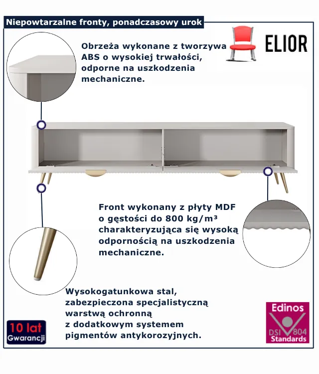 • Produkt posiada certyfikat jakości "Edinos Standards DSI 804", który potwierdza najwyższą jakość wykonania mebla oraz pełny stopień zgodności poszczególnych jednostek wytworzonego wyrobu z przyjętym wzorcem.
