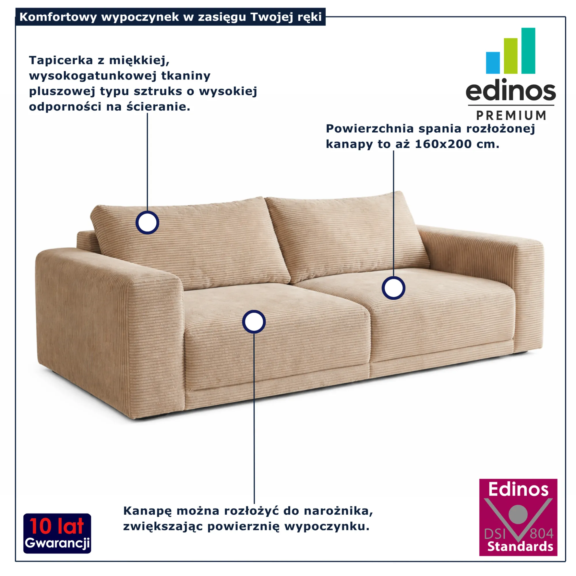 Kanapa Dierra marki Edinos Premium to połączenie stylu, funkcjonalności i wygody, które sprawdzi się w każdym domu. Jej uniwersalność oraz możliwość zmiany układu sprawiają, że łatwo dopasujesz ją do swoich potrzeb. To inwestycja w komfort codziennego życia i estetykę wnętrza. Wybierz kanapę, która pracuje dla Twojej wygody. Zainwestuj w nią ją już dziś korzystając z atrakcyjnej ceny promocyjnej 2998 zł!