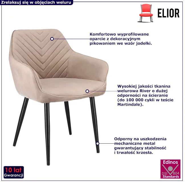 • tapicerka krzesła została wykonana z aksamitnej tkaniny welurowej River, która wyróżnia się dużą odpornością na ścieranie (do do 100000 cykli w teście Martindale)