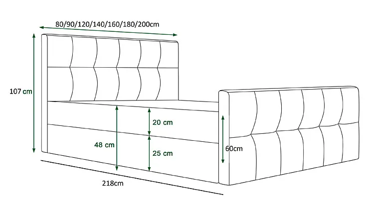 • Wymiary całkowite: długość 205 cm, szerokość materaca + 5 cm.
