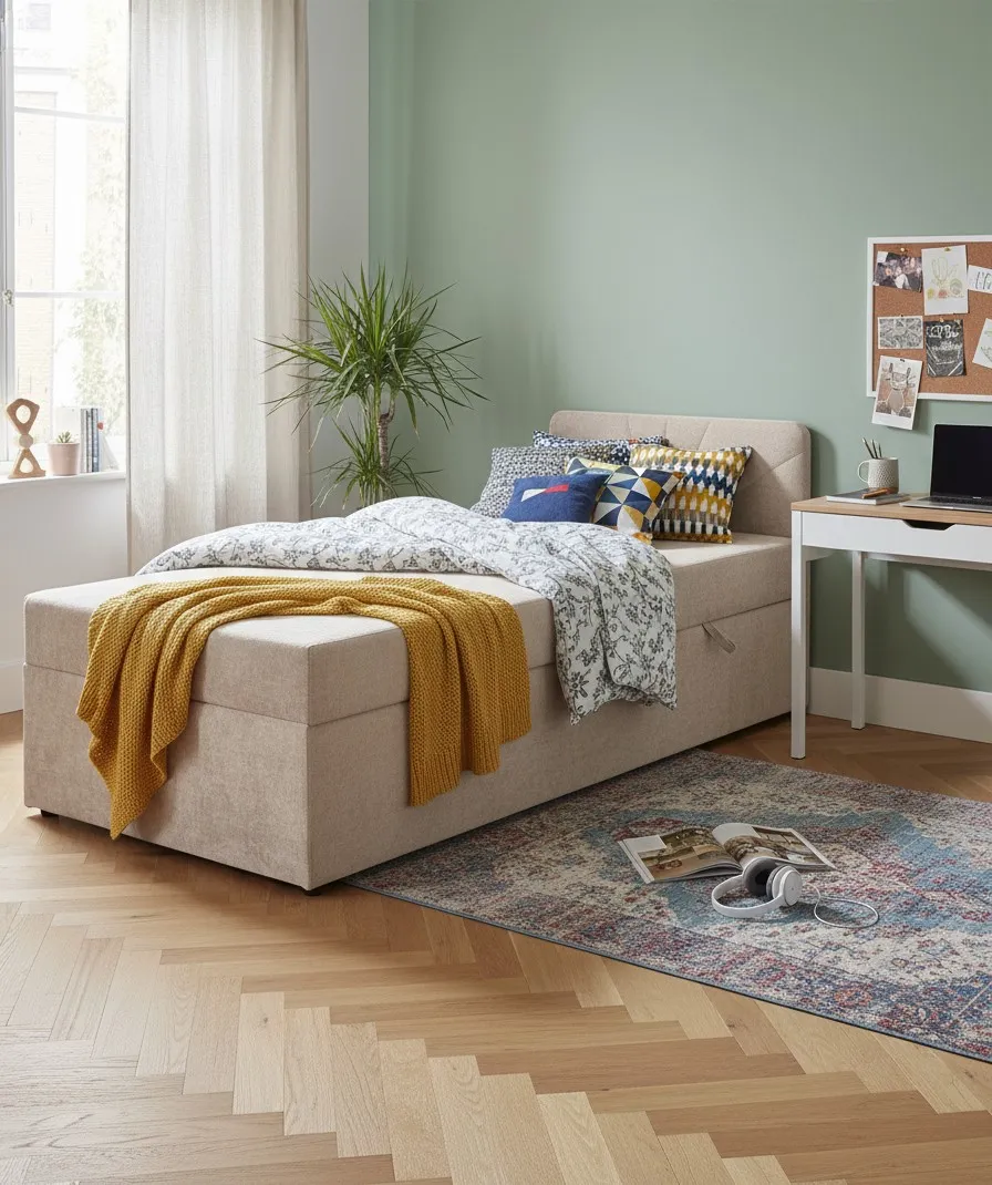 Łóżko ma bardzo przyjemną, jasną tapicerkę, która wprowadza do sypialni ciepły, spokojny klimat. Pojemnik pod stelażem świetnie sprawdza się na pościel i pozwala utrzymać porządek, a tapicerowany zagłówek daje wygodne oparcie podczas czytania. Konstrukcja wygląda na solidną i stabilną, co daje poczucie komfortu codziennego użytkowania