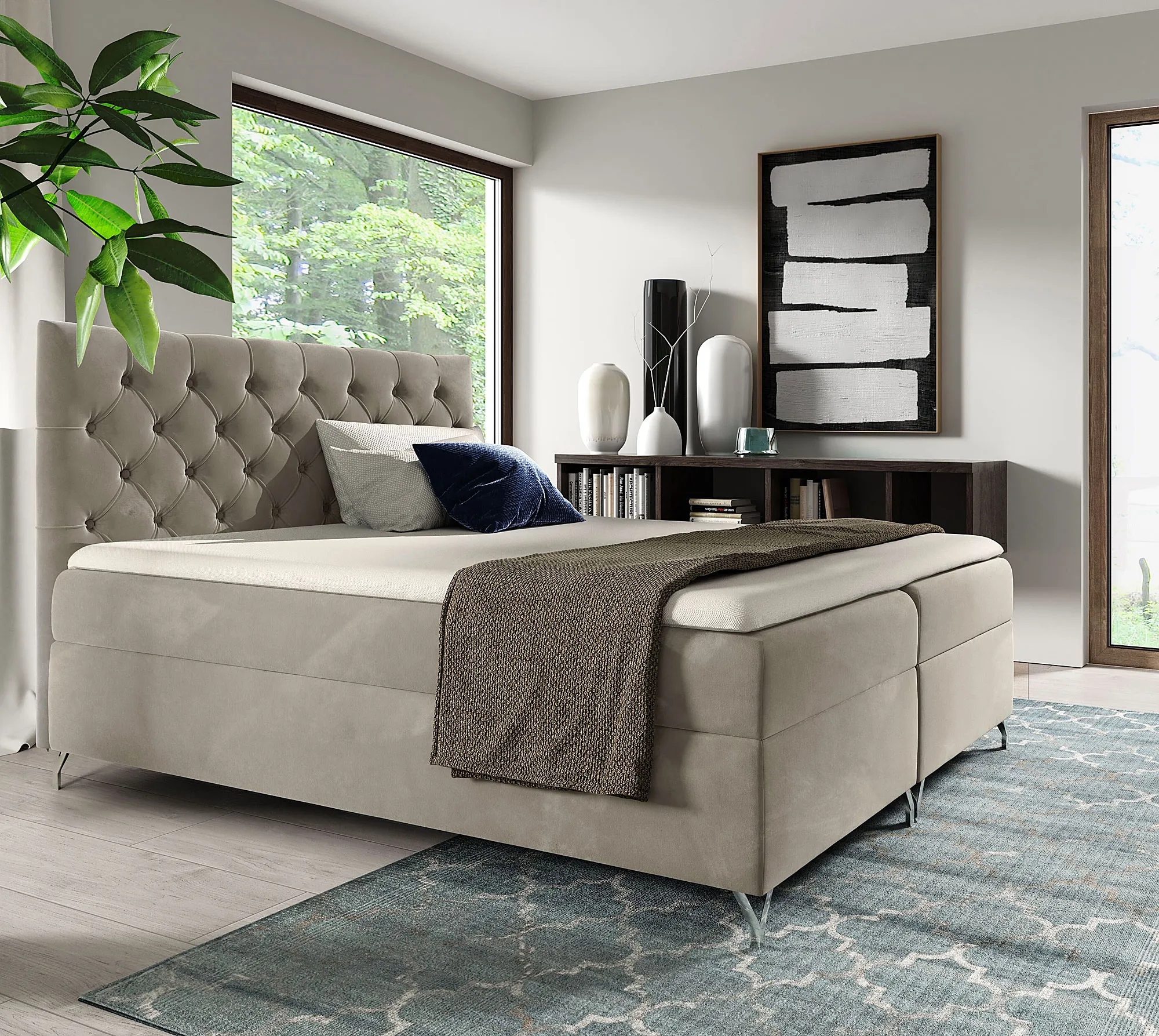 Aranżacja sypialni z beżowym łóżkiem kontynentalnym Lunavello 4X