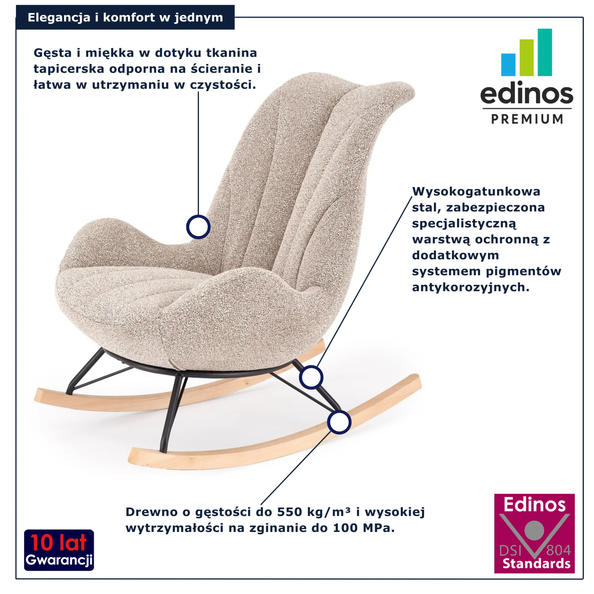 • Produkt posiada certyfikat jakości "Edinos Standards DSI 804", który potwierdza najwyższą jakość wykonania mebla oraz pełny stopień zgodności poszczególnych jednostek wytworzonego wyrobu z przyjętym wzorcem.