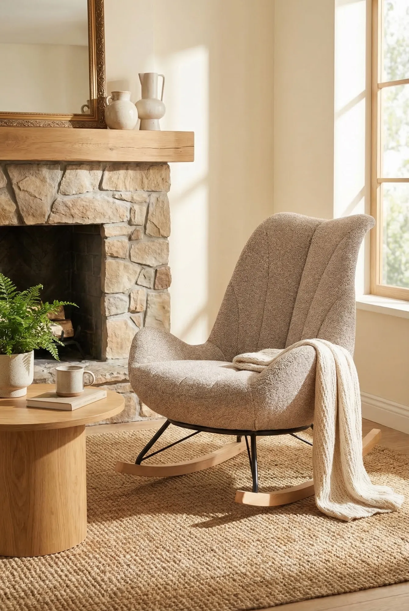 Przykładowa aranżacja z beżowym miękkim fotelem bujanym Arezia