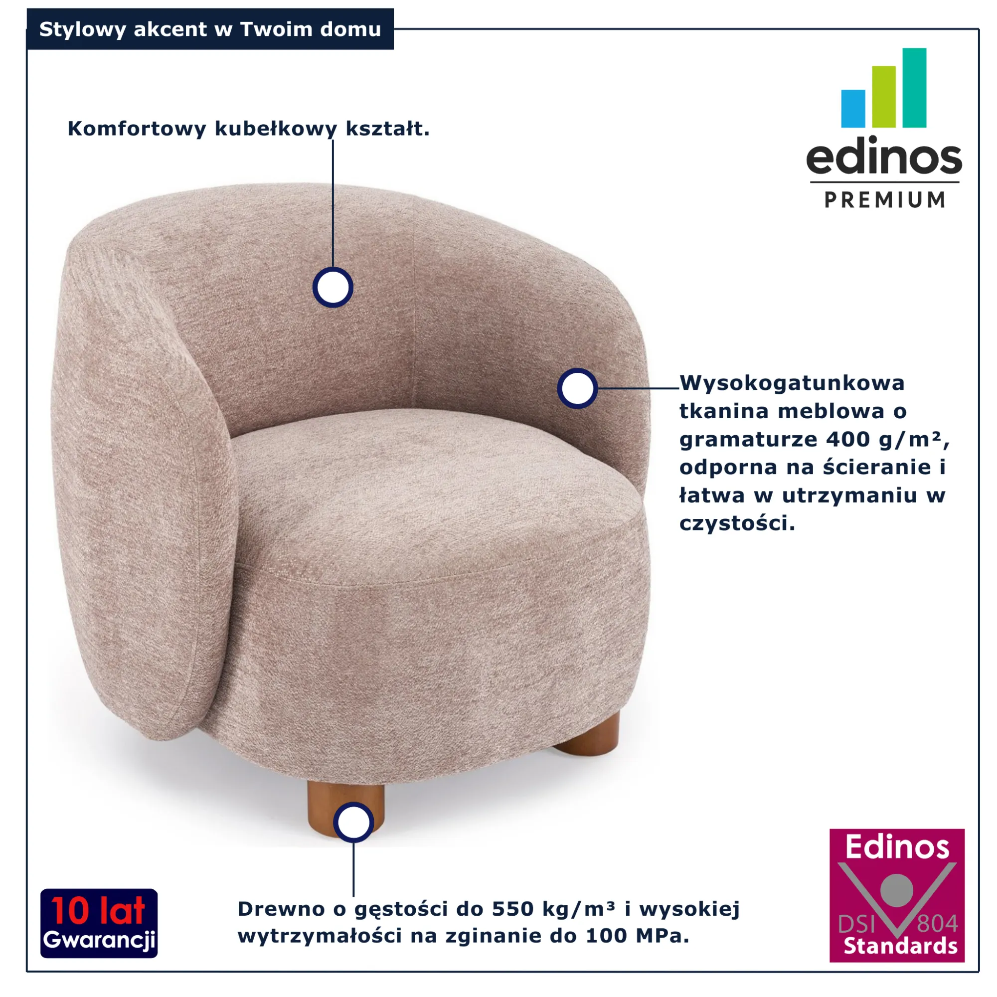 • Produkt posiada certyfikat jakości "Edinos Standards DSI 804", który potwierdza najwyższą jakość wykonania mebla oraz pełny stopień zgodności poszczególnych jednostek wytworzonego wyrobu z przyjętym wzorcem.