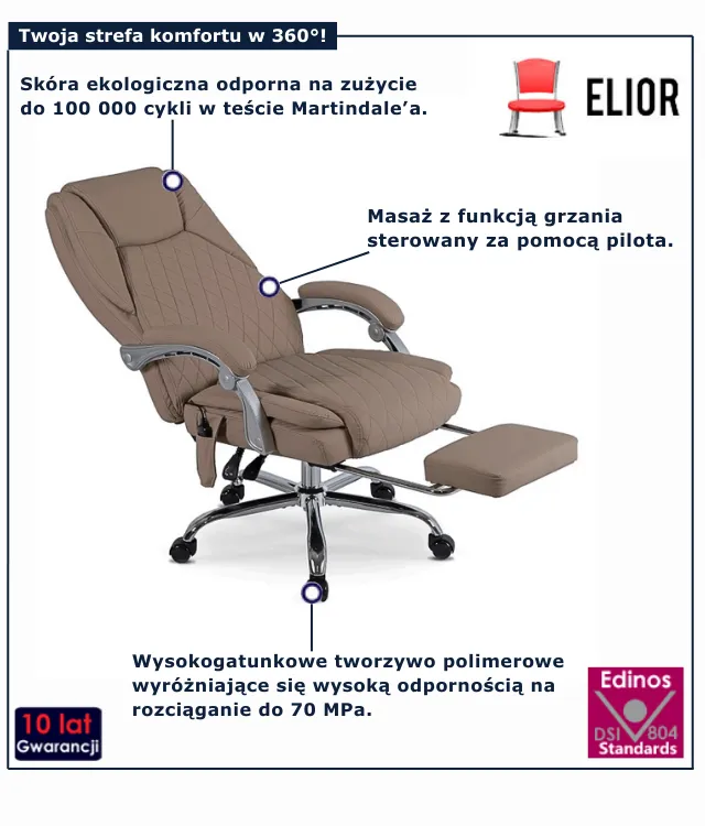 Marzysz o miejscu, które w jednej chwili zmieni się z centrum dowodzenia Twoją produktywnością w oazę głębokiego relaksu? Wyobraź sobie, że po intensywnym dniu pracy nie musisz rezygnować z wygód SPA – wystarczy, że sięgniesz po pilota. To właśnie komfort, na jaki zasługujesz: połączenie ergonomii, która wspiera Twój kręgosłup podczas długich godzin przy biurku, z funkcjami pozwalającymi rozpuścić napięcie w ramionach i plecach bez wstawania. Ten fotel to więcej niż mebel; to Twój osobisty terapeuta i projektant dobrego samopoczucia w jednym. Stworzysz przestrzeń, w której efektywna praca spotyka się z chwilami absolutnego odprężenia. Pozwól, by Twój dom stał się synonimem komfortu na najwyższym poziomie.