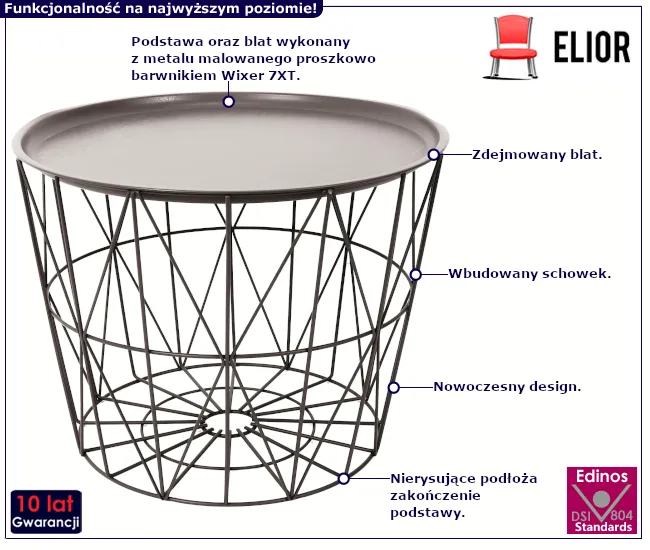 • Podstawa oraz zdejmowany blat wykonane zostały z najwyższej jakości nierdzewnego metalu malowanego proszkowo metodą elektrostatyczną. Dzięki temu mebel jest odporny na zarysowania i zadrapania. Najwyższa jakość techniki metody natrysku proszkowego pozwoliła zaoferować firmie Elior aż 10 lat gwar. na swoje produkty.