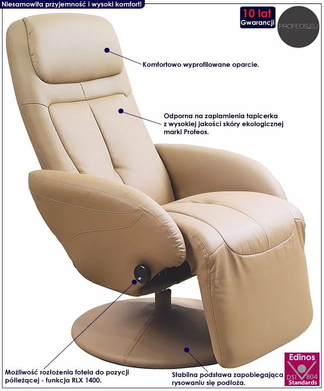 Fotel jest jednym z najstarszych i najważniejszych mebli towarzyszących człowiekowi. Nie od dziś wiadomo, że stan poruszenia naszego umysłu w różnych etapach życiowych, przyjmuje wartości pozytywne jak i negatywne. Korzystając z codziennych, darmowych i magicznych usług Twojego fotela możesz sprawić, aby uczucia interpretujące emocje które do nas docierają, obierane były w sposób miły, pozytywny a nawet twórczy. To właśnie ten mebel powinien zagwarantować Ci wygodną chwilę relaksu i odprężenia, pomagając odkryć dodatkowe pokłady energii, które w sobie ukrywasz. Zadbaj więc o to, aby to właśnie Twój fotel reprezentował najwyższą formę i klasę jakości oraz stylu. Postaw na markę Profeos, która jako jedyna na rynku zapewnia Ci aż 10 lat gwarancji oraz niedościgniony, jakże wyjątkowy i nagradzany na całym świecie design.