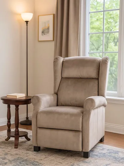 Beżowy fotel uszak z funkcja rozkładania Ferro