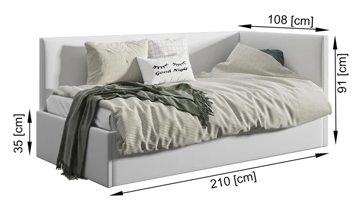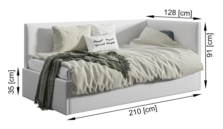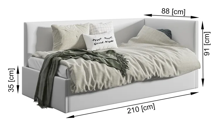 • Wymiary: wysokość całkowita: 91 cm, szerokość: 88 cm, długość: 210 cm, wysokość boczka: 35 cm.