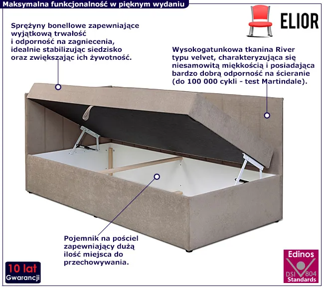 Tapczan Topeo marki Edinos Premium to idealne rozwiązanie dla osób ceniących elegancję i funkcjonalność. Wyróżnia się nowoczesnym designem, który doskonale wpasuje się w każdy wystrój wnętrza. Obszerne oparcie i tapicerowany bok zapewniają komfortowy wypoczynek, a wysokiej jakości tkanina dodaje całości szyku. Tapczan wyposażony jest w przestronny pojemnik na pościel, co czyni go niezwykle praktycznym meblem do sypialni czy pokoju gościnnego. Solidna konstrukcja gwarantuje trwałość na lata, a łatwość w utrzymaniu czystości sprawia, że tapczan Topeo jest doskonałym wyborem dla każdej rodziny.