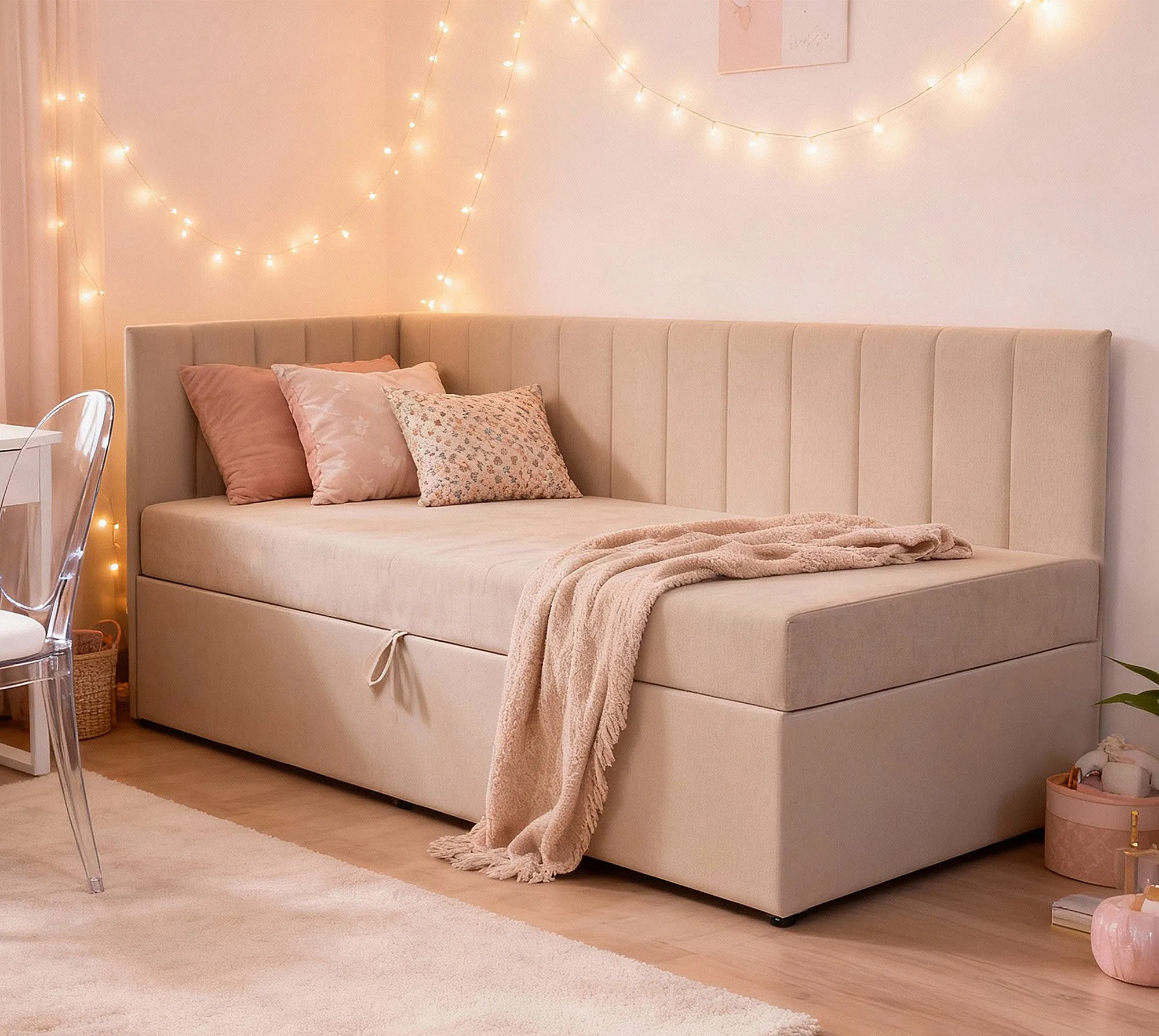 • Pojemnik na pościel: Przestronny schowek pod tapczanem umożliwia przechowywanie pościeli i innych przedmiotów, co pomaga utrzymać porządek w pokoju.