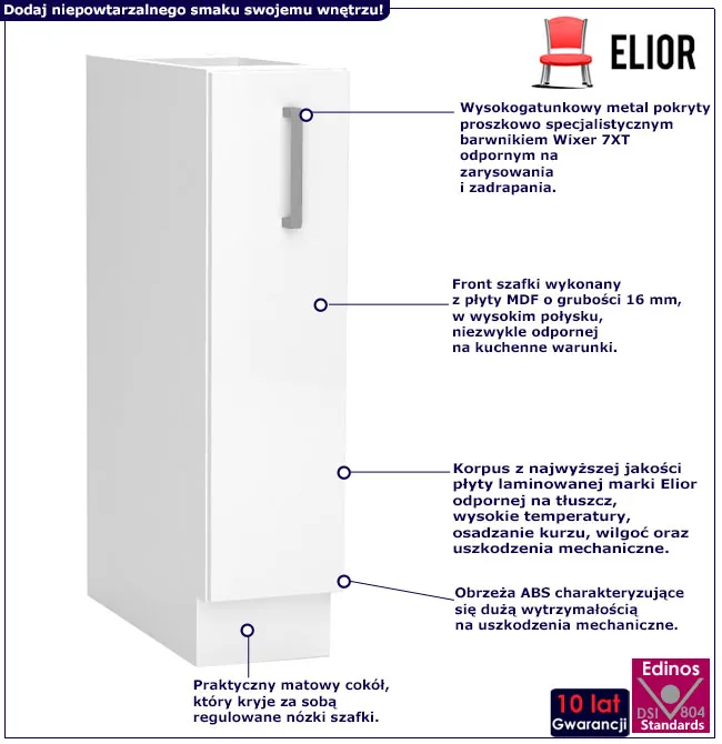 Kolekcje mebli kuchennych Elora marki Elior stworzyliśmy z dbałością o każdy szczegół, tak by wybrane przez Ciebie meble służyły Ci niezmiennie przez długie lata. Dzięki nim dodasz smaku Twojemu wnętrzu i urządzisz kuchnię swoich marzeń. Wybieraj spośród aż 27 modułów lub 2 uniwersalnych kompletów o długości 180/240 cm oraz 260 cm. Kuchnia ma służyć Ci długo, dlatego oczekujesz od niej funkcjonalności oraz trwałości. Z tego powodu każdy z białych korpusów szafek kolekcji Elora wyprodukowany został z najwyższej jakości płyty laminowanej o klasie higieny E1, niezwykle odpornej na warunki panujące w kuchni podczas gotowania. Fronty wykonano natomiast z płyty MDF o wysokim połysku, przepięknie komponującej się razem z mocnymi uchwytami stworzonymi z wysokogatunkowego metalu o wykończeniu podobnym do chromowanej stali. Do wyprodukowania kolekcji Elora wykorzystano także najwyższej jakości szkło podwójnie hartowane, niezwykle odporne na uderzenia i zarysowania w eleganckiej wersji satynowej. Każdą szufladę wzmocniono za pomocą wkładu o głębokości 40 cm typu METALBOX, co daje fantastyczny komfort w codziennym użytkowaniu. Do zestawu dołączony jest biały cokół do każdej z dolnych szafek oraz regulowane nóżki. Fronty otwierają się dzięki trwałym metalowym zawiasom, a górne szafki uchylne do góry za pomocną specjalnych, wysokiej jakości gazowych podnośników. Wybierz jakość mebli marki Elior, która zostanie z Tobą na długo i ciesz się swoją kuchnią niezmiennie, latami.