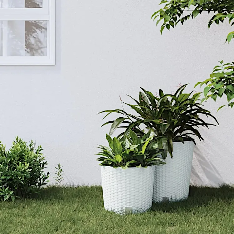 Donica ma fany, subtelny wygląd rattanu w białym odcieniu i ładnie prezentuje się na tarasie z kwiatami. Materiał wygląda trwało, a powierzchnia jest gładka, więc podlewanie nie zostawia smug. Rośliny wydają się dobrze „siedzieć” w donicy.