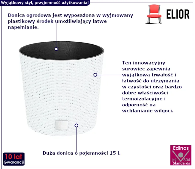 Donica ogrodowa Azura marki Edinos Premium to nie tylko miejsce na Twoje rośliny, ale także elegancka ozdoba, która wniesie styl i nowoczesność do Twojej przestrzeni. Jej biały, rattanowy wygląd przyciąga wzrok, dodając lekkości i klasy zarówno w ogrodzie, jak i na balkonie. Azura została zaprojektowana z myślą o wygodzie – wewnętrzna wkładka sprawia, że napełnienie donicy staje się szybkie i proste, a Twoje rośliny otrzymują idealne warunki do wzrostu. To stylowe rozwiązanie dla każdego, kto chce, aby jego zieleń wyglądała jeszcze piękniej. Połącz elegancję z funkcjonalnością w jednym!