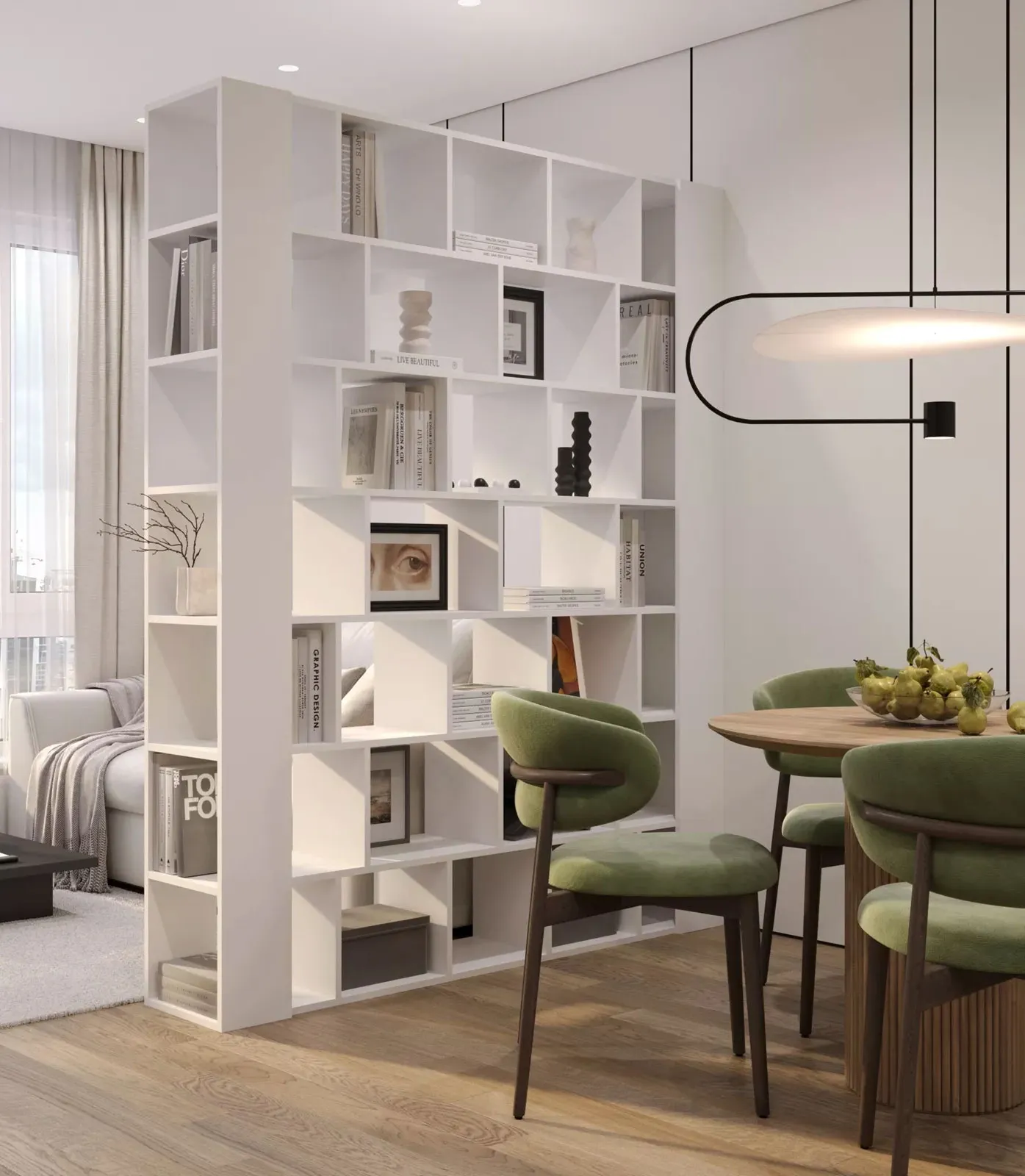 Salon z wykorzystaniem ażurowego regału Naseri białego