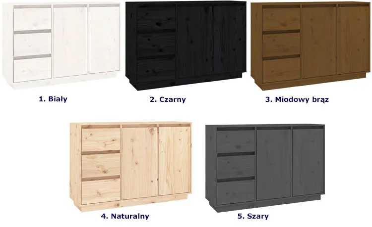 Kolory komody drewnianej z 3 szufladami i dwudrzwiową szafką Orelia