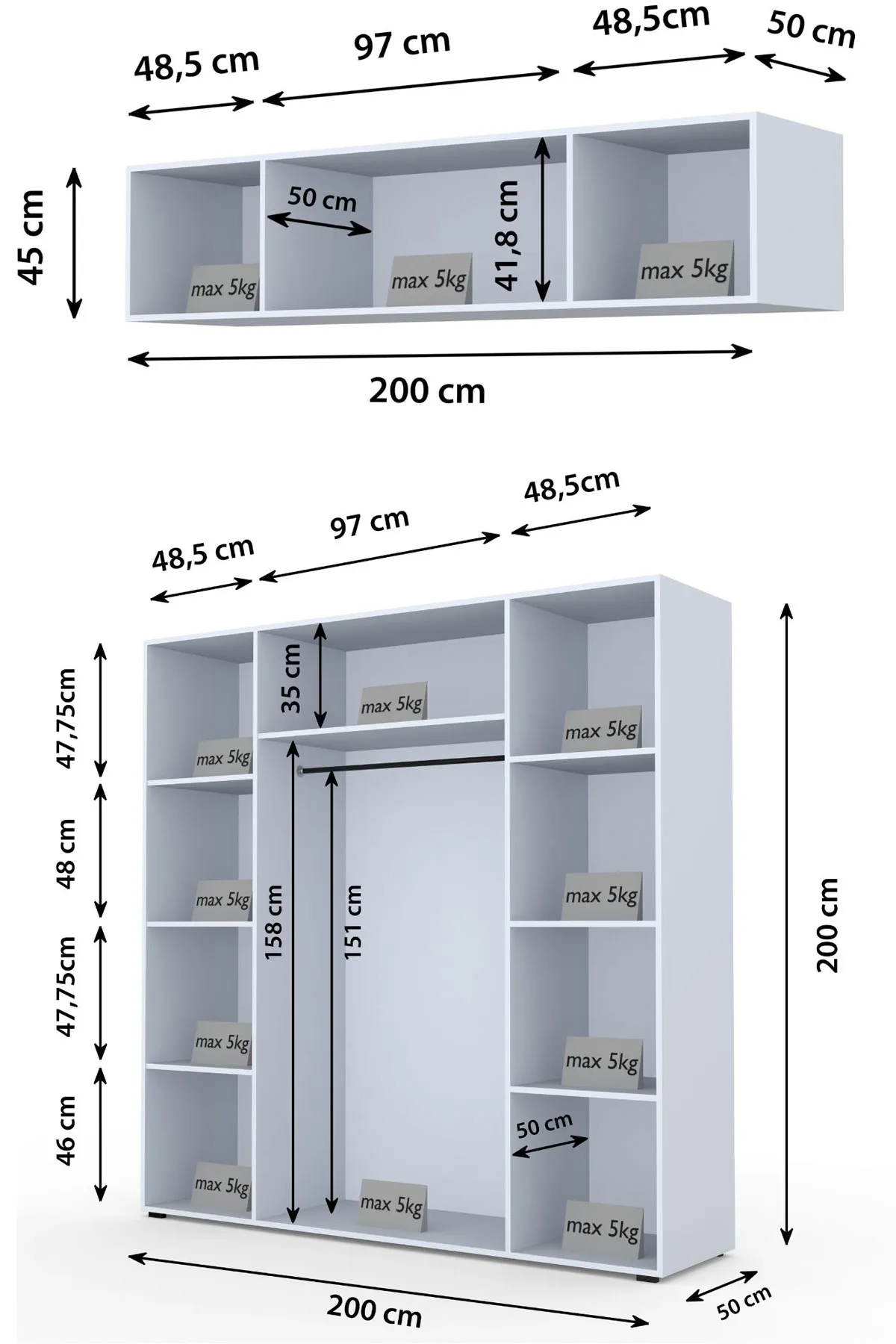 • szerokość: 200 cm, wysokość: 200 cm, głębokość: 50 cm.