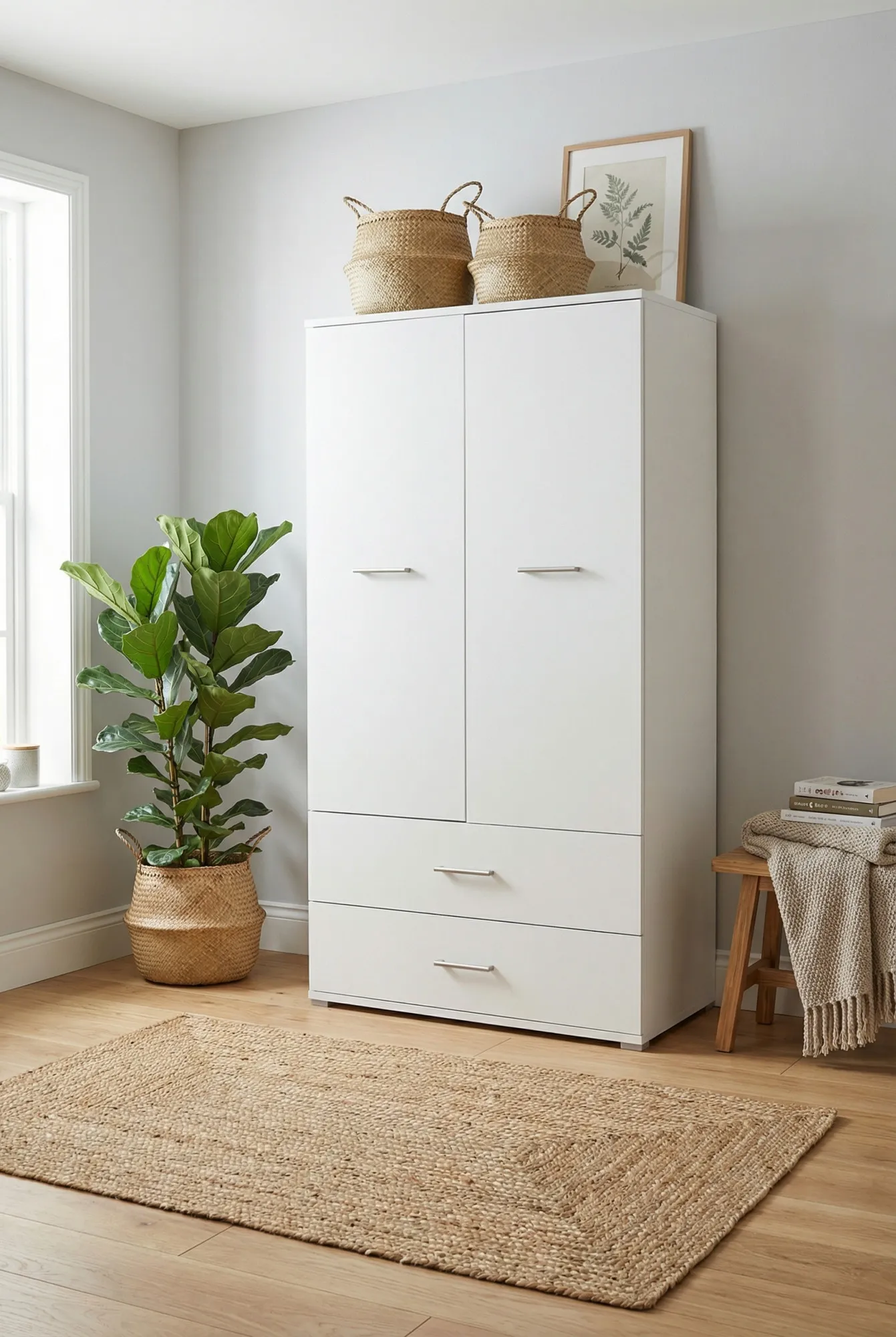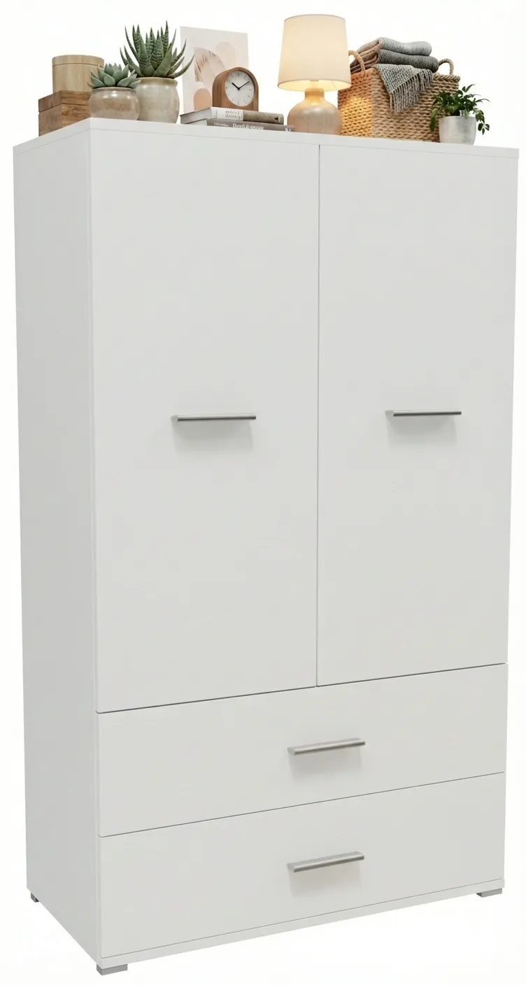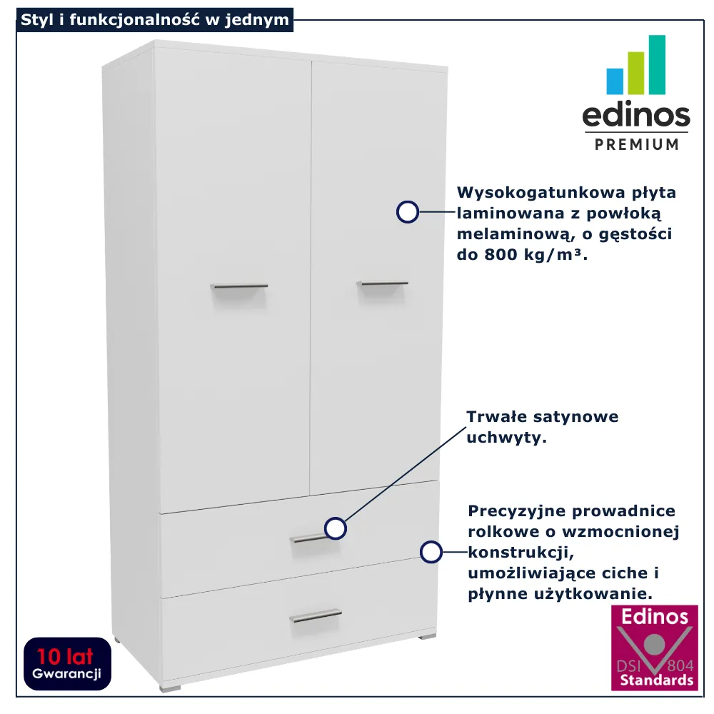 Szafa dwudrzwiowa z 2 szufladami Asendri 14X marki Edinos Premium to połączenie klasycznej przestrzeni na ubrania wiszące z dodatkową, wygodną strefą do przechowywania drobiazgów. Jej proporcjonalna, smukła forma sprawia, że świetnie sprawdzi się zarówno w mniejszych pomieszczeniach, jak i jako element większej zabudowy. Wnętrze szafy zostało zaprojektowane tak, aby maksymalnie ułatwić organizację garderoby – od ubrań codziennych po sezonowe dodatki. To mebel, który łączy estetykę z codzienną funkcjonalnością.