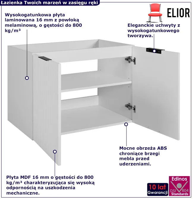 - Korpus z laminowanej płyty meblowej 16 mm odporny na wilgoć i codzienne użytkowanie, doskonale sprawdza się w warunkach łazienkowych.