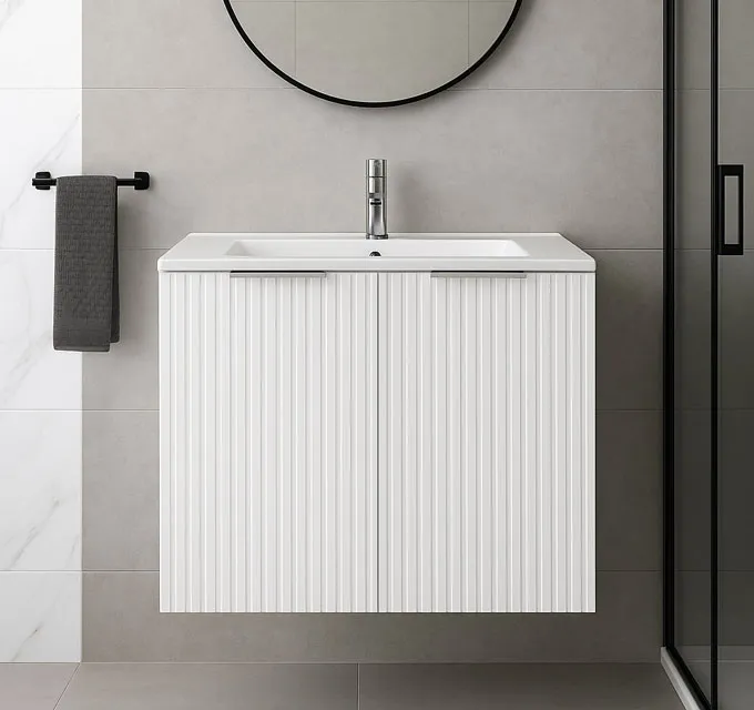 - Fronty wykonane z frezowanej płyty MDF 16 mm zapewnia trwałość i dekoracyjny wygląd. Ryflowana powierzchnia dodaje głębi i elegancji.
