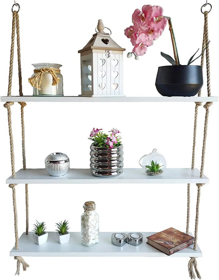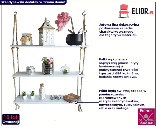 Przyswojenie nowych rytuałów może być nieco trudne, są jednak sposoby, które Ci to ułatwią. Dodatkowe ułatwienia w postaci mebli, dzięki którym zagospodarujesz przestrzeń wokół siebie. Co powiesz na subtelną półkę wiszącą w przedpokoju? To właśnie ona posłuży Ci jako odpowiednie miejsce np. dla kluczy, chusteczek czy innych drobiazgów, których poszukujesz w ostatniej chwili. Będzie to także wspaniały element dekoracyjny w salonie czy pokoju młodzieżowym. Z łatwością ustawisz na niej ulubioną kolekcję figurek, zdjęcia czy kwiatki. Takie elementy sprawią, że pomieszczenie nabierze ciekawego, przytulnego akcentu. Zaletą prezentowanej przez nas półki wiszącej jest z pewnością uniwersalna kolorystyka. Odcień bieli alpejskiej rozświetli wnętrze pomieszczeń w Twoim domu i sprawi, że będą one przejrzyste oraz jasne. Dodatkowym atutem będzie również naturalny akcent jutowego sznurka, dzięki któremu mebel wpasuje się w aranżacje zaprojektowane w stylu skandynawskim, rustykalnym, boho oraz retro/vintage.